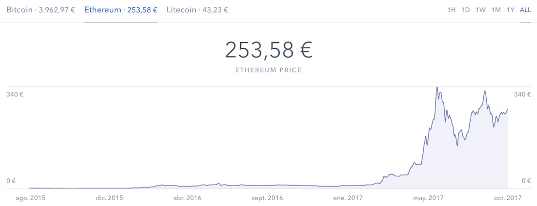 Te hemos dejado una gráfica con la evolución de la cotización del Ethereum para que no haga falta darte argumentos para comprar Ethereum.