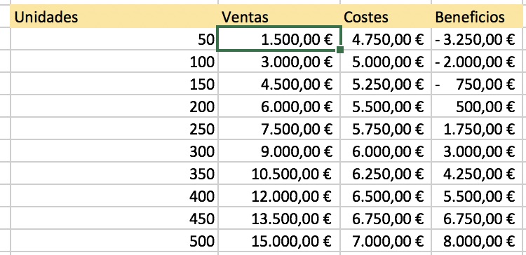 Ahora elaboraremos una tabla en la que podemos ver la evolución de los gastos y los beneficios en función de las unidades vendidas: